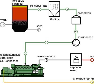 Двигатели были адаптированы для работы на 100% коксового газа, 100% природного газа или смеси коксового/природного газа (60/40). Схема получения и сжигания газа показаны на рисунке № 2.