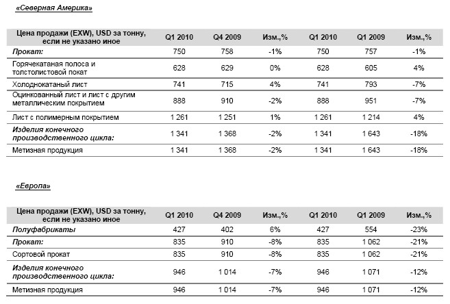 | Объемы продаж, метрические тонны, если не указано иное | Q1 2010 | Q4 2009 | Изм.,% | Q1 2010 | Q1 2009 | Изм.,% |