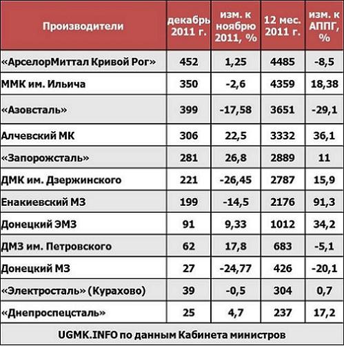 | 01 .01.2011 | 01 .01.2012 | Изменение цены (%) | Изменение цены (грн./т) | ||