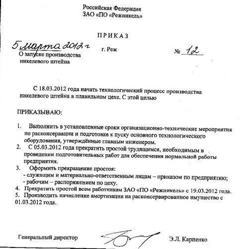 ЗАО ПО "Режникель", рабочие которого с октября прошлого года отправлены в принудительные отпуска, выйдет из простоя на следующей неделе. В конце февраля - начале марта уже был проведен предварительный запуск отдельных участков предприятия, в настоящий момент администрация подготавливает всю необходимую документацию для перезапуска завода и вывода людей из простоя. С 5 марта в цехах проводятся подготовительные работы, а с 19 предприятие будет запущено в рабочем режиме, выпуск никелевого штейна начнется 18 марта.