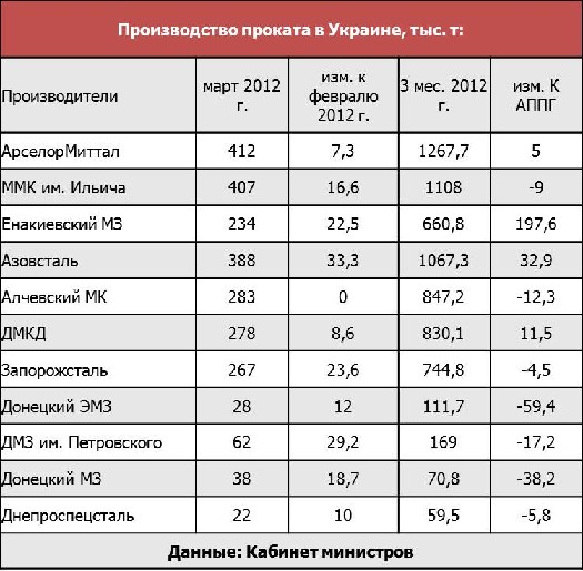 Согласно данным правительства, в первом квартале 2012 г. украинские метпредприятия произвели 7,103 млн. т проката, что на 0,3% меньше АППГ. В ушедшем месяце выпуск проката по сравнению с мартом 2011 г. упал на 11,7%, тогда как по сравнению с февралем 2012 г. производство выросло на 15% до 2,475 млн. т.
