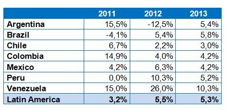 Аргентина, Чили и Колумбия пересмотрели свои ожидания вниз, в то время как прогнозы по Бразилии Перу сохранены на прежнем уровне. В то же время, Мексика и Венесуэла пересмотрели свои первоначальные прогнозы роста потребления на 2012 и 2013 несколько вверх, основываясь на обнадеживающих результатах первого квартала 2012 г.