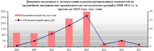 По данным INFOLine, пиковым по количеству введенных в эксплуатацию крупных производственных площадок стал 2011 год, когда были финализированы порядка 10 инвестиционных проектов. Совокупный ввод новых мощностей по производству металлоконструкций составил более 200 тыс. тонн в год. Тем не менее, часть проектов были заморожены на неопределенный срок или отложены совсем ввиду различных причин, в том числе из-за осложнения финансового состояния и усугубления условий финансирования. Так, в период кризиса порядка 17 крупных проектов не были доведены до завершения. Большинство из них в начале кризиса находилось на начальных стадиях реализации - проекты, которые к концу 2008 года находились на этапе строительных работ или монтажа оборудования, в большей своей части все-таки были завершены, хотя и с задержками.