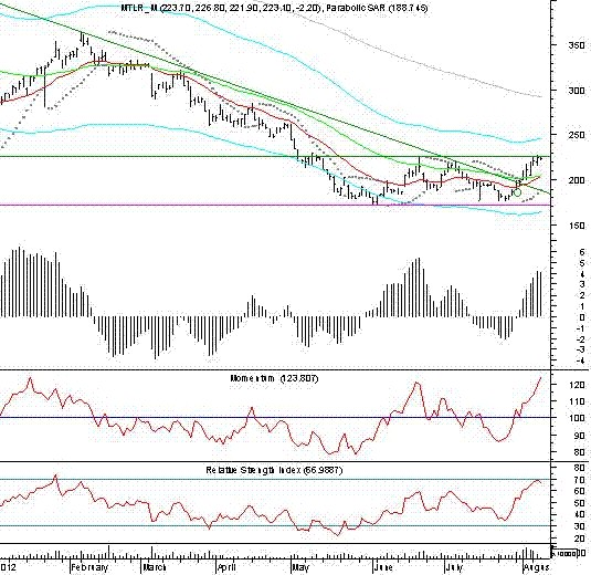 На среднесрочном графике видно, как в рамках обозначенного бокового коридора, акции "Мечела" 31 июля 2012 г. прорывают вверх среднесрочное сопротивление, сформированное одновременно нисходящей линией тренда и своей 50-дневной скользящей средней.