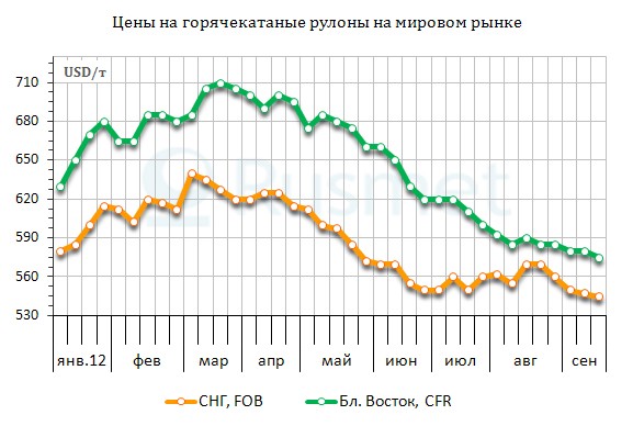 Российские экспортеры плоского проката удерживают цены на более высоком уровне, чем украинские конкуренты, из-за большей диверсификации экспорта. В частности, российские горячекатаные рулоны пользуются спросом в Иране, Италии, странах Восточной Европы. Средний уровень цен на эту продукцию, как правило, не опускается ниже $550-560 за т FOB. Холоднокатаные рулоны российского производства предлагаются по $620-630 за т FOB.
