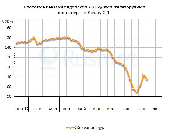 В последний месяц спотовые цены на железорудное сырье на мировом рынке отличаются повышенной нестабильностью. В начале сентября стоимость 63,5%-ного индийского концентрата, поставляемого в Китай, сократилась до около $95 за т CFR, что соответствовало уровню ноября 2009 года. Однако сообщение китайской Национальной комиссии по развитию и реформам о планах запуска крупномасштабных инфраструктурных проектов на общую сумму более $155 млрд. вызвало подъем цен на стальную продукцию в Китае и катапультировала цены на руду на отметку $112 за т CFR. Впрочем, в последнюю неделю цены на сырье снова пошли вниз, стабилизировавшись на уровне $107-108 за т CFR. Теперь рынок ждет недельная пауза, вызванная празднованием очередной годовщины образования КНР.