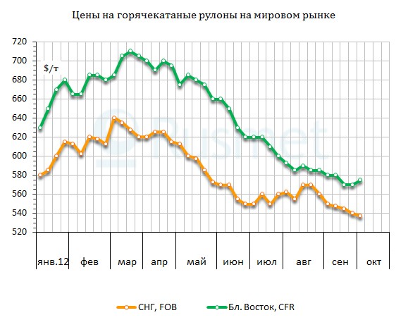 В сентябре значительную активность на ближневосточном рынке проявляли китайские компании, предлагавшие горячекатаные рулоны в страны Персидского залива и Средиземноморья практически по одной цене ? $560-575 за т CFR. В первую неделю октября китайцы отсутствуют на рынке, так как празднуют очередную годовщину основания КНР, однако на их нишу претендуют корейские компании. Стоимость их горячего проката при поставках в страны Персидского залива не превышает $565-580 за т CFR. В то же время, украинские компании из-за более высоких затрат на доставку котируют свою продукцию в регионе не ниже $580 за т CFR.