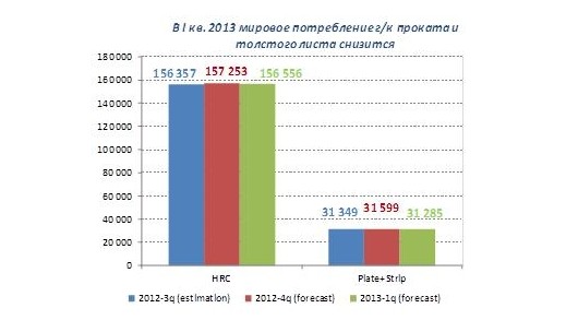В I квартале 2013 года ожидается отрицательная динамика. Потребление плоского проката в данный период, по нашим оценкам, снизится на 0,5% или 1,01 млн. т, в. т. ч. по рулонному прокату снижение составит 0,4% или 0,7 млн. т и по толстому листу - 1% или 0,31 млн. т.