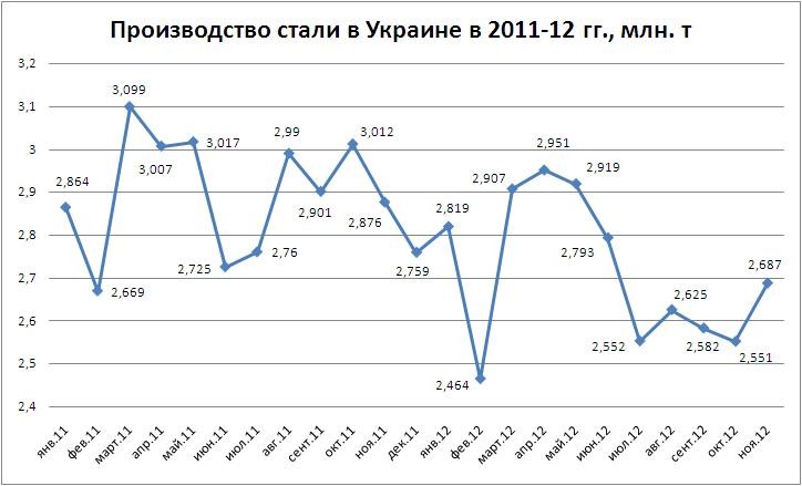 В ноябре 2012 г. выплавка стали выросла по сравнению с октябрем 2012 г. на 1,3%, до 2,687 млн. т, по сравнению с ноябрем 2011 г. снизилась на 6,6%. -- UGMK.INFO (Украина)