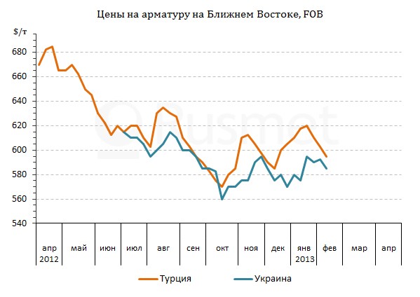 Цены на длинномерный прокат в странах Ближнего Востока достигли минимума в конце января – начале февраля. Слабый спрос на конструкционную сталь в Турции, а также низкая активность в большинстве стран – импортеров этой продукции заставили металлургов пойти на существенные уступки. Котировки на турецкую арматуру сократились до $590-600 за т FOB, а в некоторых сделках, по словам трейдеров, цены могли опускаться и до $585 за т FOB. Стоимость украинской арматуры уменьшилась до $580-590 за т FOB, а Белорусский метзавод согласился сбросить цены до $565 за т FOB при условии предоплаты.