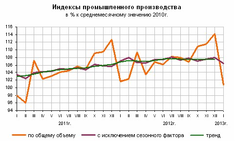 Индекс промышленного производства1) в январе 2013г. по сравнению с январем 2012г. составил 99,2%, по сравнению с декабрем 2012г. - 88,2%.