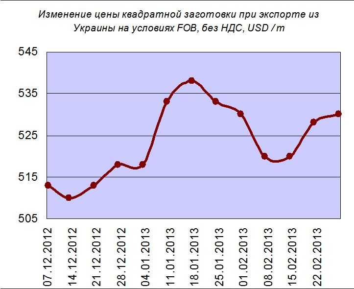 По данным УПЭ, стоимость квадратной заготовки, экспортируемой из Украины, в феврале увеличилась с 520 до 530 долл./тонн. Причем основной прирост цены наблюдался во второй половине месяца. МК зафиксировал схожую тенденцию: в начале февраля квадратная заготовка подешевела на 5 долл., до 523 долл./тонн, а вот во второй половине месяца начался плавный рост цены, и к концу февраля стоимость полуфабриката достигла 530 долл./тонн.