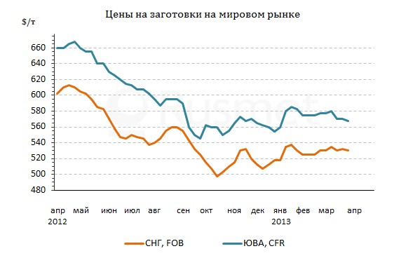 Во второй половине марта были вынуждены отказаться от намеченного ранее повышения корейские компании. Если в начале прошлого месяца они пытались довести стоимость заготовок до более $570 за т FOB, то в конце его они заключали сделки из расчета $570-575 за т CFR – наравне с японскими поставщиками. Продукция из СНГ еще в начале третьей декады марта могла продаваться в Индонезию по $575 за т CFR, но ближе к началу апреля экспортеры вынужденно сбросили цены до $560-565 за т CFR. А встречные предложения в их адрес приходят уже на уровне $550 за т CFR, что практически закрывает возможность поставок полуфабрикатов из черноморских портов (по крайней мере, при нынешних котировках на Ближнем Востоке).