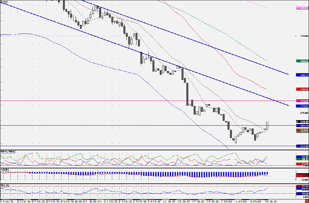 Таким образом, более агрессивные инвесторы могут открывать длинные позиции по бумагам с целью реализации сформированной фигуры на отметке 283 руб., при этом инвесторам менее склонным к риску стоит дождаться уверенного закрепления акций над линией "шеи" 266,70 руб., усиленной близостью прохождения 10-дневной скользящей средней.