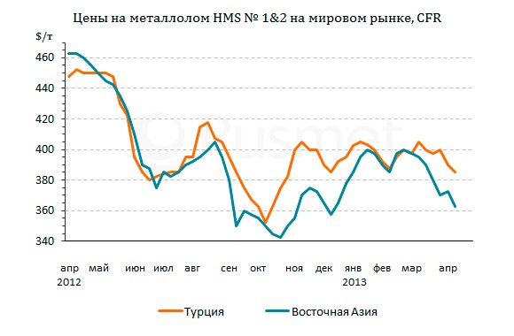 В Турции американские компании в течение всего марта и первой декады апреля указывали стоимость своего материала HMS № 1&2 (80:20) на уровне, как минимум, $400-405 за т CFR, а их западноевропейские коллеги – $395-405 за т CFR. Реальных же продаж на таких условиях не было. В крайнем случае, турецкие компании приобретали румынский металлолом, в апреле понизившийся в цене до около $375 за т CFR. Равновесие оказалось нарушенным только ближе к середине апреля, когда американские и европейские экспортеры согласились сбросить котировки на HMS № 1&2 (80:20) до $380-390 за т CFR.