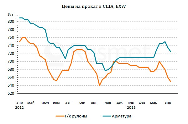 Впрочем, еще хуже складываются дела на американском рынке плоского проката. Средний уровень цен на горячекатаные рулоны, по данным компании CRU, в начале второй половины апреля впервые с октября прошлого года опустился до менее $600 за короткую т – до около $590 за короткую т ($650,5 за метрическую т) EXW. Так как конкуренция со стороны импорта в этом сегменте незначительная, спад произошел, прежде всего, из-за слабого спроса.