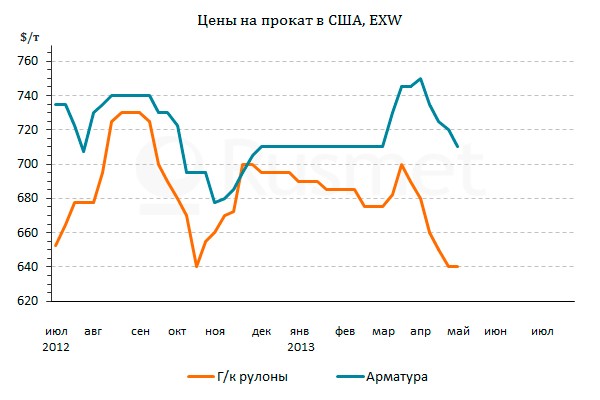 Еще более сложной для металлургов выглядит текущая ситуация на американском рынке плоского проката. По данным трейдеров, объем предложения горячекатаных рулонов является избыточным. Поставщики жестко конкурируют друг с другом, наперебой предлагая скидки. В начале мая горячий прокат котировался в США, в среднем, по $640 за метрическую т EXW, причем, многие участники рынка не считают этот уровень минимальным.