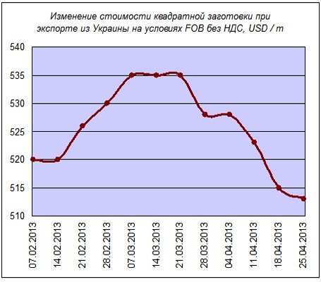 По данным ГП "Укрпромвнешэкспертиза" (УПЭ), в апреле 2013 года стоимость слябов и плоского проката, поставляемых на экспорт, снижалась. По сравнению с концом марта слябы подешевели на 40 долл., до 475 долл./тонн, и практически сравнялись с январскими ценами. ИА "Металл-Курьер" зафиксировало снижение стоимости экспортируемых слябов на 32 долл., до 483 долл./тонн.