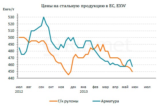 Котировки на длинномерный прокат на внутреннем рынке Евросоюза тоже быстро вернулись на прежний уровень: 440-450 евро за т EXW в странах юга Европы и до 475 евро за т EXW в Германии и Польше. Как считают многие участники рынка, цены могут сохраниться примерно на этом уровне до сентября. Увеличения спроса со стороны европейских строительных компаний в обозримом будущем не ожидается, но и объем предложения будет ограниченным, так как многие производители в регионе решили в этом году остановить свои мини-заводы на ремонт и профилактику на все лето.