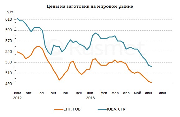 В принципе, турецкие компании не отказываются от приобретения заготовок из СНГ, но только дешево. Те украинские и российские производители, которые успели распродать июньские полуфабрикаты до начала последней недели мая, смогли это сделать по ценам выше $500 за т FOB, но в самом конце прошлого месяца котировки опустились до около $493-500 за т FOB. По некоторым данным, в начале июня последние партии июньской продукции были проданы в Турцию менее чем по $490 за т FOB.