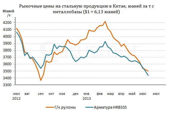 В начале второй декады июня в Китае отметили Праздник драконьих лодок, в течение которого операции на внутреннем рынке стали были приостановлены. Однако пауза продолжительностью в три рабочих дня ничего не изменила. Цены на прокат в стране продолжают свое медленное снижение. Средняя стоимость арматуры на национальном рынке сократилась до самого низкого уровня за последние четыре года (в юанях), а горячекатаные рулоны лишь ненамного превышают предыдущий минимум, установленный в начале сентября прошлого года.