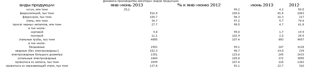 Выпуск стали в июне вырос на 0,3% в сравнении с июнем 2012 года. Производство чугуна в первом полугодии снизилось на 0,8% - до 25,1 миллиона тонн, стали - на 2,8%,до 34,7 миллиона тонн.