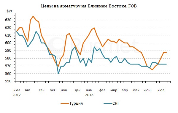 Для турецких компаний минимальный уровень находится в настоящее время на отметке $580 за т FOB. На таких условиях осуществлялись в середине июля поставки на конкурентный рынок ОАЭ. Прочие потребители в США, странах Африки и Ближнего Востока платили за турецкую арматуру примерно $585-595 за т FOB.