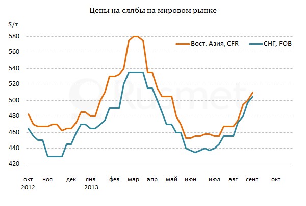 На Дальнем Востоке основными покупателями российских слябов выступили корейские и индонезийские прокатчики. Заключению сделок способствовало отсутствие конкурирующих предложений. Бразильские компании сконцентрировались на североамериканском рынке, предлагая свою продукцию в США по ценам не ниже $540-550 за т FOB с поставкой в четвертом квартале. Для заключения сделок, им, правда, приходилось идти на некоторые уступки, но для азиатских прокатчиков латиноамериканские полуфабрикаты все равно оставались слишком дорогими. Корейские и японские же производители уже несколько месяцев не предлагают слябы на продажу, сосредоточившись на готовом прокате.