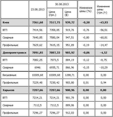 С 23 по 30 августа 2013 г. прайсовые цены на трубную продукцию в Украине понизились. Об этом свидетельствуют данные index.ugmk.info.