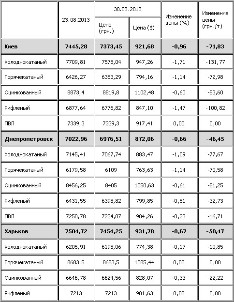 С 23 по 30 августа 2013 г. прайсовые цены на листовой прокат в Украине понизились. Об этом свидетельствуют данные index.ugmk.info.